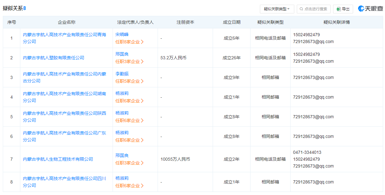 不过,据天眼查公开信息显示,杨建标还是另一家公司常春堂(内蒙古)生物技术有限责任公司(下文简称:常春堂)的法定代表人、董事长。而这家公司的股东之一正是宇航人的关联公司宇航人高技术,持股比例为49%,注册电话和邮箱与6家宇航人高技术分公司相同。