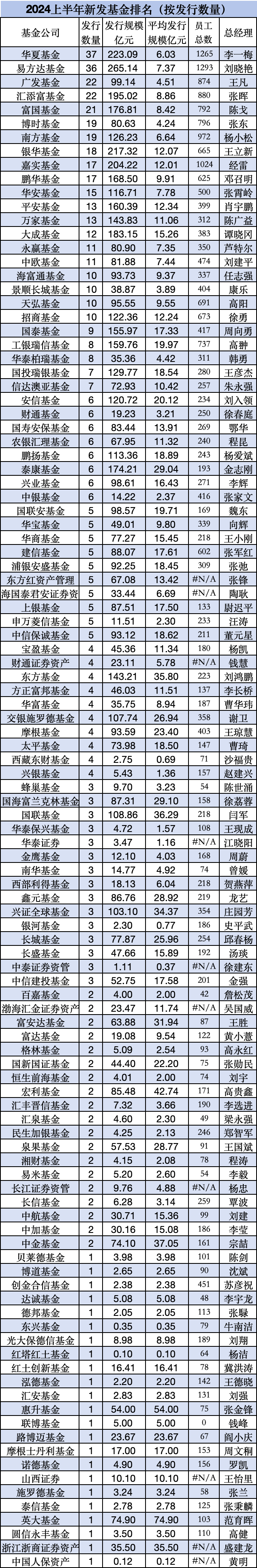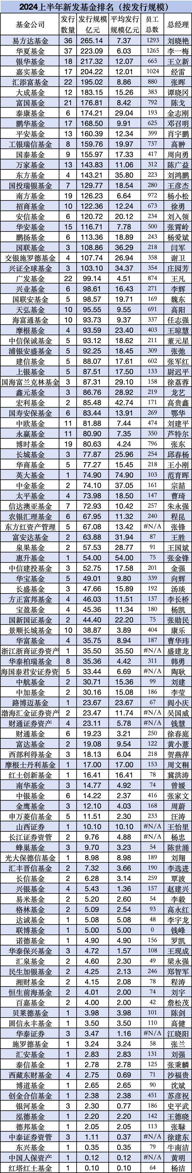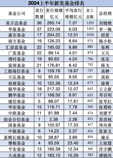 从新发基金规模,与公司员工数量结合来看,易方达、华夏、嘉实三家公司员工人数均超过1000人,上半年新发基金规模也超过200亿元。